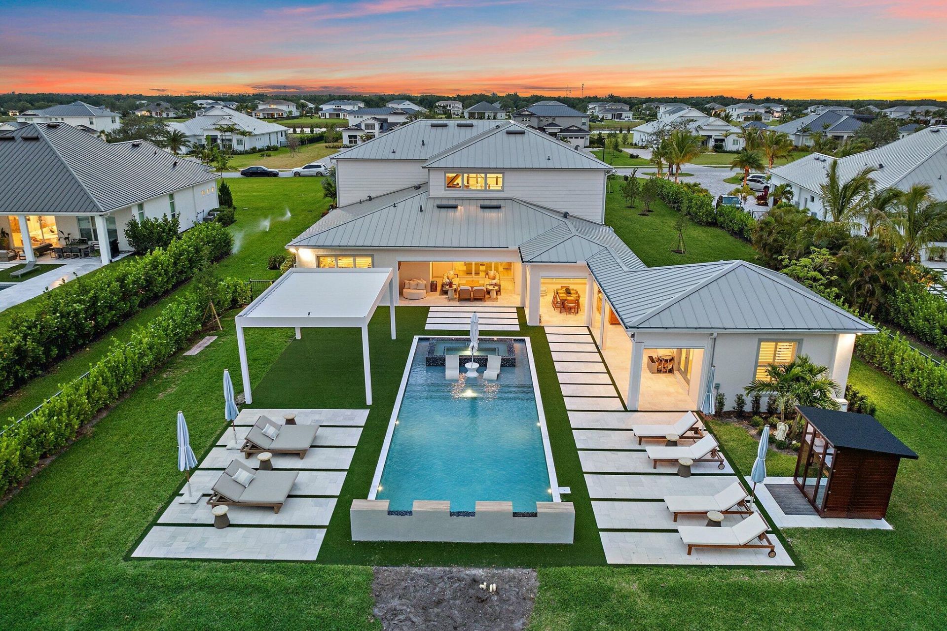 Enjoy the best of Bridgewater in this expanded ''Livingston'' model home with long water views. This seven bedroom home, the largest model offered in Bridgewater, with an office and home theater, creates multiple options of useful space with the finest in luxury appointments. The first floor has the primary suite with bath, one guest bedroom with bath, and an office in the main house, powder room, 4 car garage, and a one bedroom Casita with full bath just off the kitchen. The second floor has...Enjoy the best of Bridgewater in this expanded ''Livingston'' model home with long water views. This seven bedroom home, the largest model offered in Bridgewater, with an office and home theater, creates multiple options of useful space with the finest in luxury appointments. The first floor has the primary suite with bath, one guest bedroom with bath, and an office in the main house, powder room, 4 car garage, and a one bedroom Casita with full bath just off the kitchen. The second floor has four additional bedrooms, a loft, media room, and three full baths. The back yard has special features like artifical turf, electic screens, a summer kitchen, pool with spa, sauna, and best of all, a custom pergola with a louvered ceiling that has slats that electronically open and close.