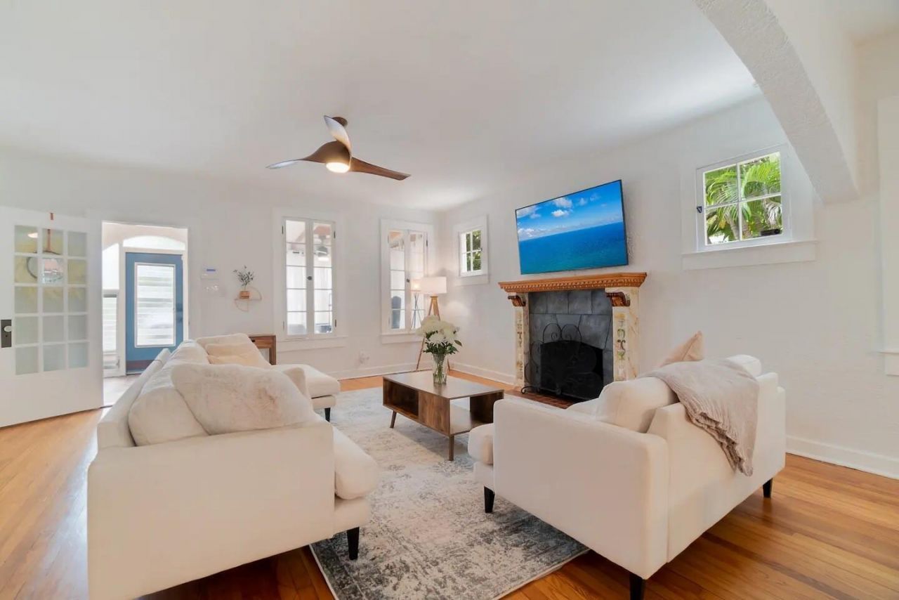 Charming 1920s Spanish home with guest cottage in the highly coveted SoSo neighborhood. The 3BD/1BA main house (1,200 sq ft) features a lovely sunroom, 2021 roof, beautiful hardwood floors, updated bath, high ceilings, fireplace, & a stylish kitchen w/ breakfast bar & gas range. The 1BD/1BA cottage (378 sq ft) offers central A/C, a full kitchen, & a covered patio. A long driveway & detached storage garage add convenience. Enjoy a walkable lifestyle, blocks from the Intracoastal Waterway & minute...Charming 1920s Spanish home with guest cottage in the highly coveted SoSo neighborhood. The 3BD/1BA main house (1,200 sq ft) features a lovely sunroom, 2021 roof, beautiful hardwood floors, updated bath, high ceilings, fireplace, & a stylish kitchen w/ breakfast bar & gas range. The 1BD/1BA cottage (378 sq ft) offers central A/C, a full kitchen, & a covered patio. A long driveway & detached storage garage add convenience. Enjoy a walkable lifestyle, blocks from the Intracoastal Waterway & minutes to restaurants. Close to Palm Beach Island, Downtown WPB, PBI Airport, Brightline, world-class shopping & dining, tennis center, marinas, golf courses, & more. Living area per public records includes sunroom (receives cooling from adjoining spaces, no dedicated AC vent). Living Sq Ft per MLS also includes detached cottage. Buyer to verify all measurements & suitability.
