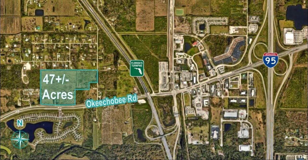 47 prime acres on Okeechobee Road directly across the street from D R Horton's Creekside project, west of Florida'sTurnpike. Frontage on Okeechobee Road with eastbound turn lane and frontage on Coolidge Road. Land use RS allows for2 units per acre density. Possible to change all or part to higher density. Ideal land for new development